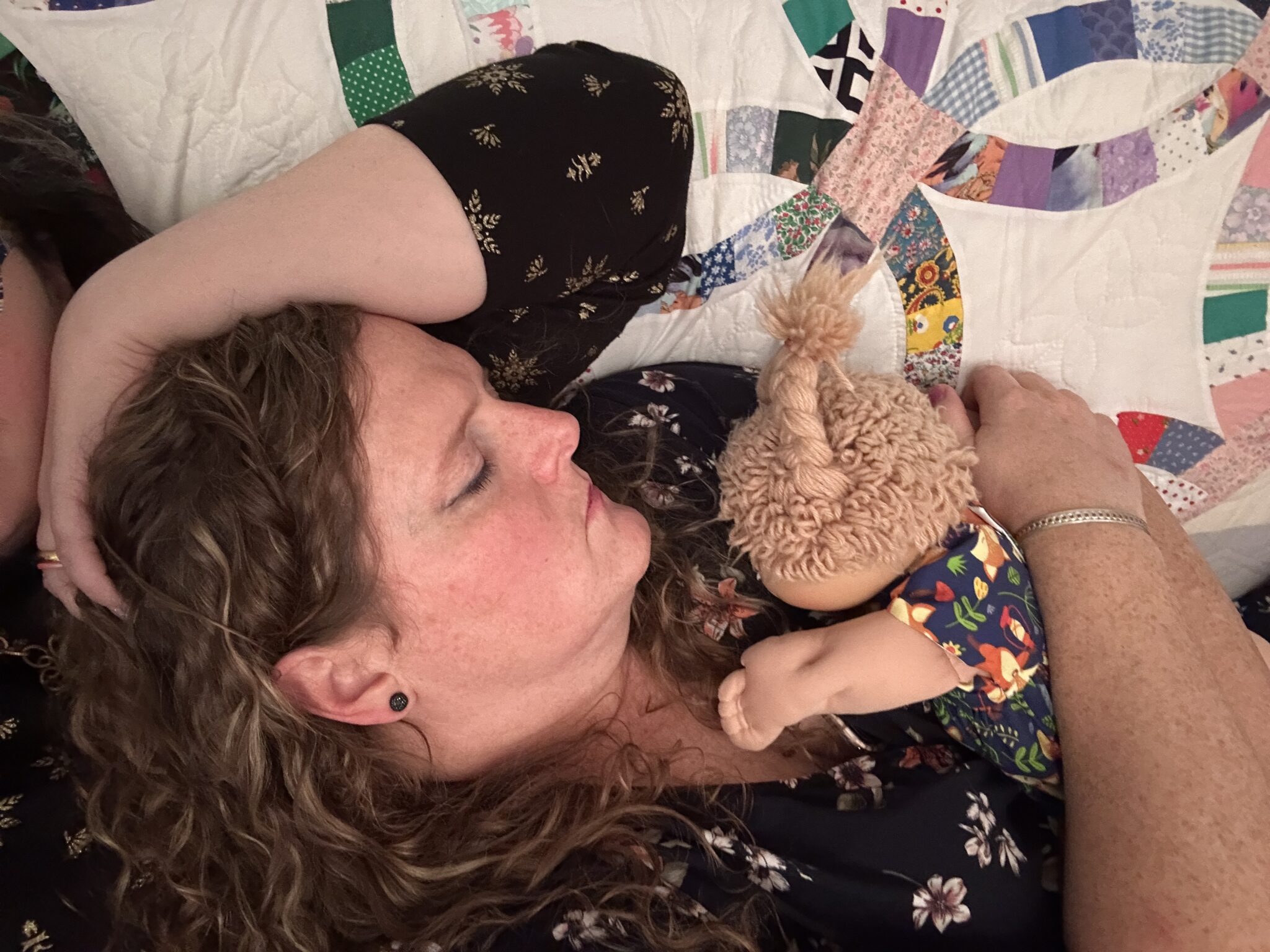 I couldn’t put her down. Eventually the kids wandered away to do their own teenager things and my wife settled into one end of the couch to read. I leaned up against her and cuddled my doll. I was there for hours, cradling her, shifting her from one baby-holding position to another. I smelled her hair (it smells like yarn). I kissed her forehead.